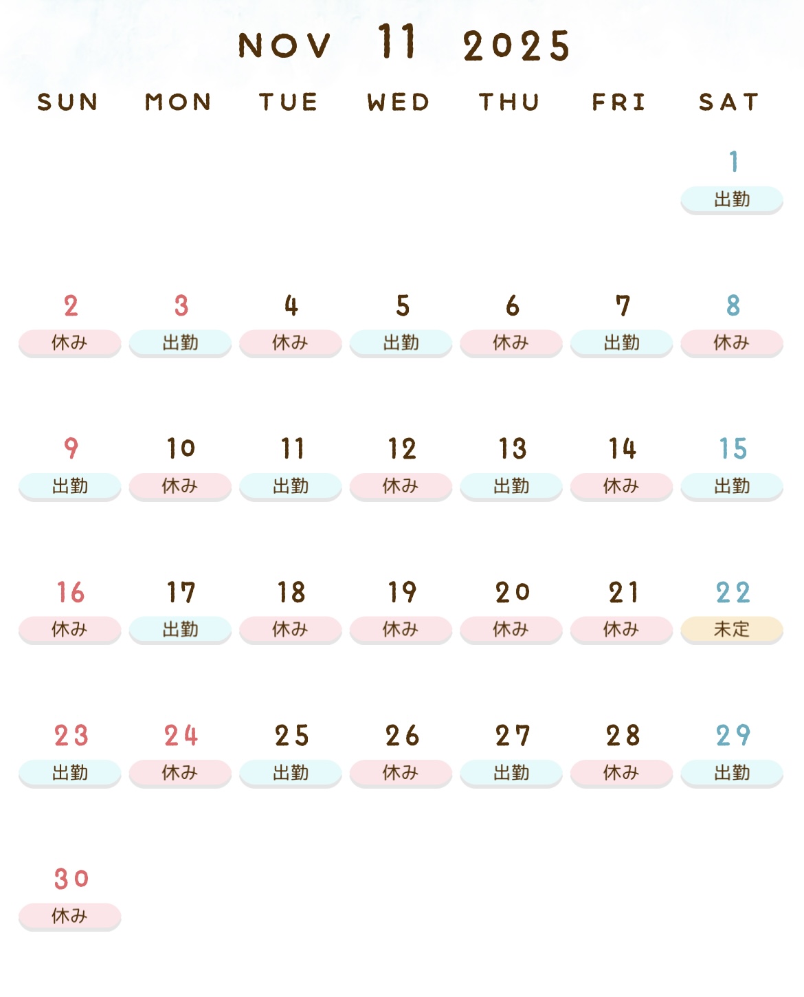 出勤予定 → 26(日)29(水)30(木)1(土)11:00 〜 20:00 ※ 20:00〜 130分コースまで案内🉑
