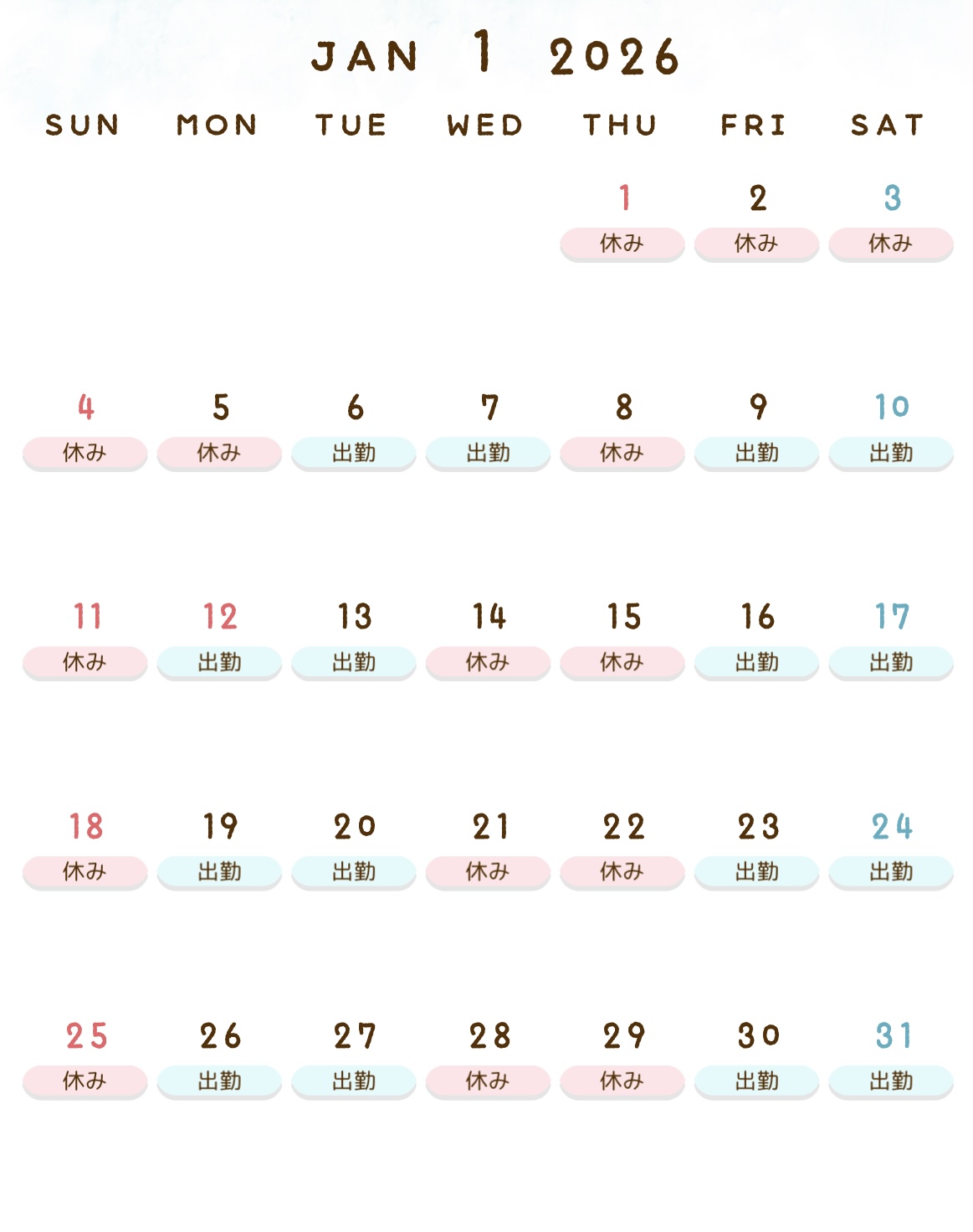 1月から再び曜日での出勤に戻すことにしました。曜日が以前と多少違います。