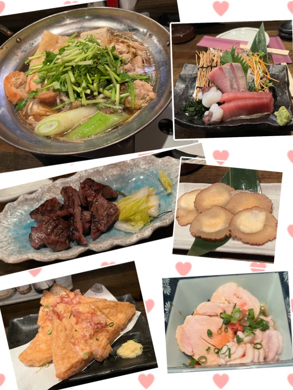 定義の三角揚げ、せり鍋、牛たん、いぶりがっこクリームチーズ、あん肝&白子ポン酢
