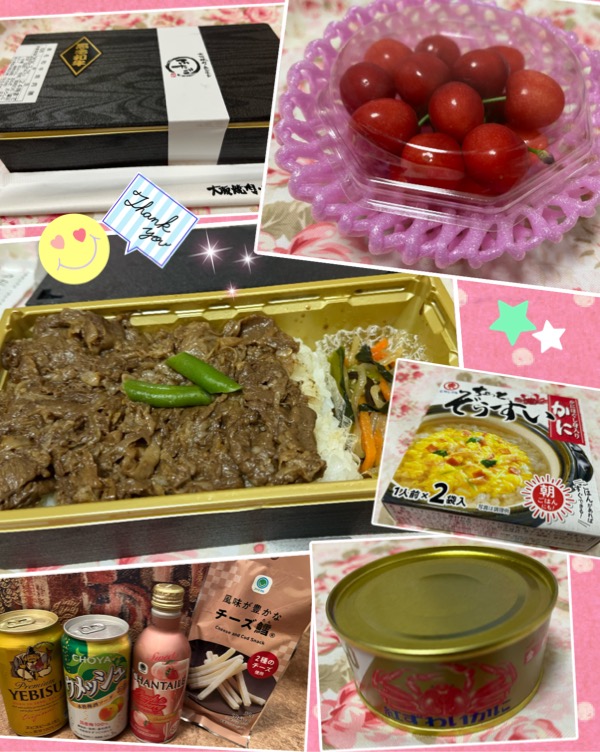 有名な焼肉屋さんのお弁当、初物♡ というサクランボ、蟹缶、かに雑炊、アルコールあれこれ&おつまみと、きょうかの好みを色々考えてくださった(*T▽T*)、嬉しい差し入れ沢山(๑°ㅁ°๑)‼︎ ありがとうございました♡